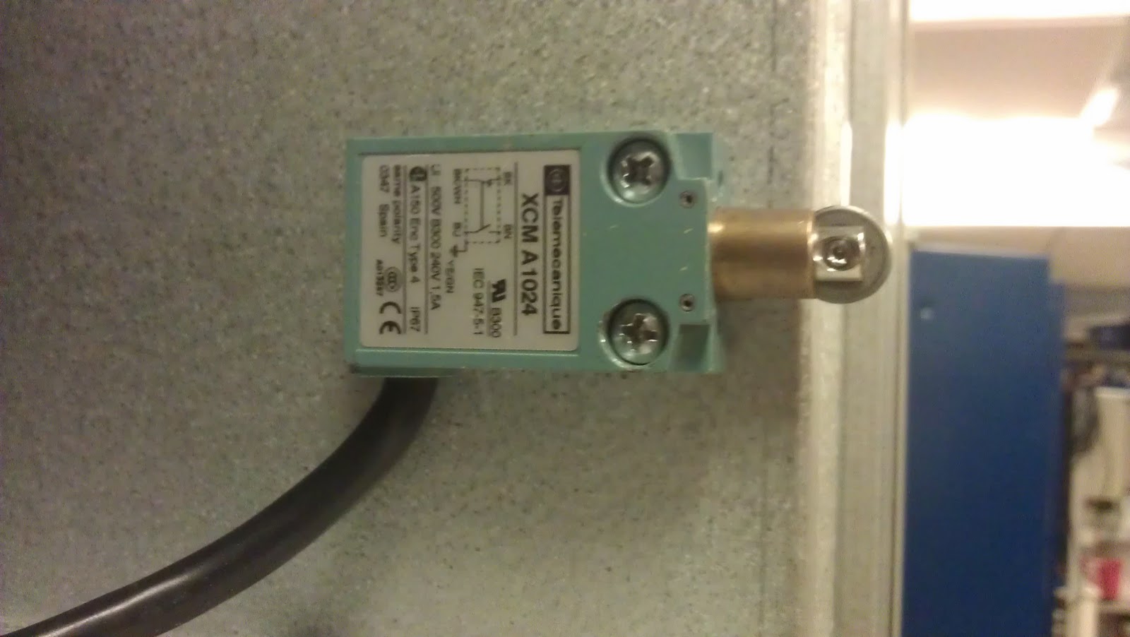 I dag hadde jeg programmet til skjermen klart. Jeg hadde lagd en oversiktlig og grei meny. Det var fort gjort å lage. Og da jeg kom på skolen begynte jeg å tenkte litt på sikkerhet rundt anlegget. Vis man åpner opp døren, så har man full tilgang til alle viftene og varmebatteriet. Og det er ikke veldig sikkert, så jeg fant ut at vi måtte ha noe som detekterer at døra er åpen. Først tenkte vi at vi skulle bruke en initiator, som merker om det er metall foran seg eller ikke. Men siden vi hadde brukt dette så mye, så brukte vi en endebryter istedet.
